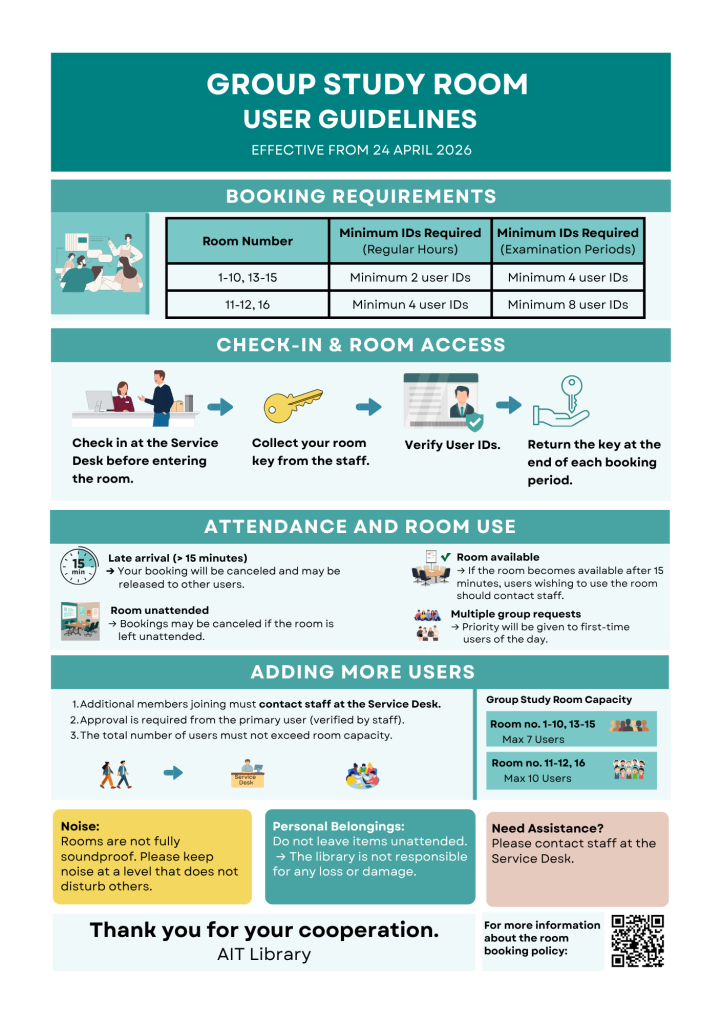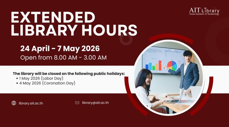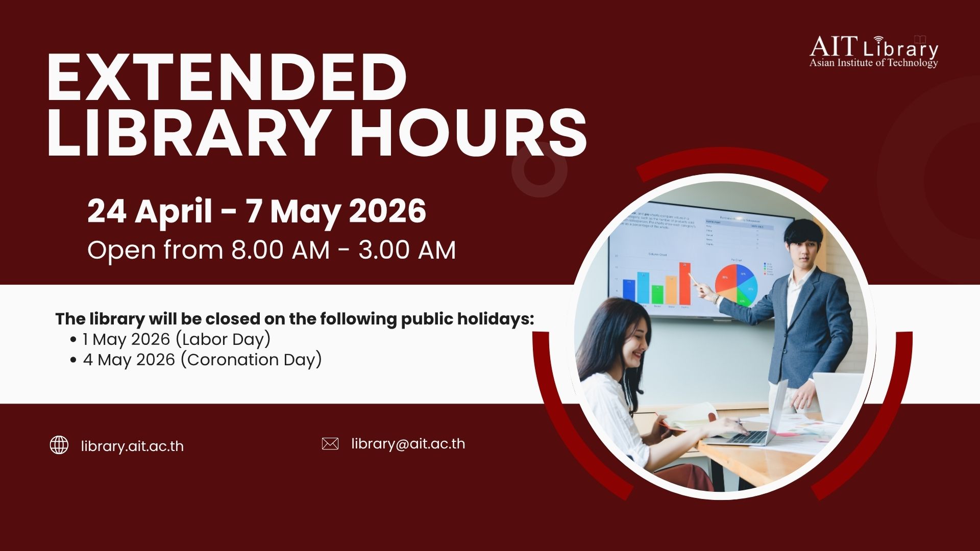Please be informed that from 24 April to 7 May 2026, the AIT Library will extend its opening hours from 8:00 AM to 3:00 AM to support the final examination period.